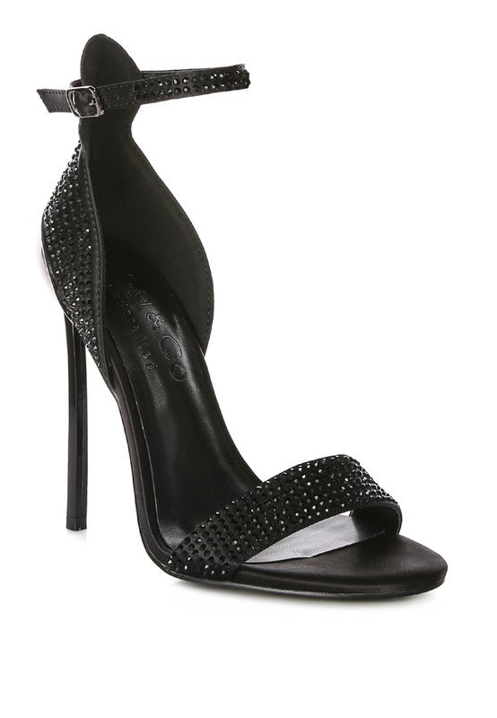 Diamnte Heat Set High Heeled Party Sandals, this pair of stiletto sandals come with pin buckle fastening which secures feet well. It has lightly cushioned insole which cuts strain.